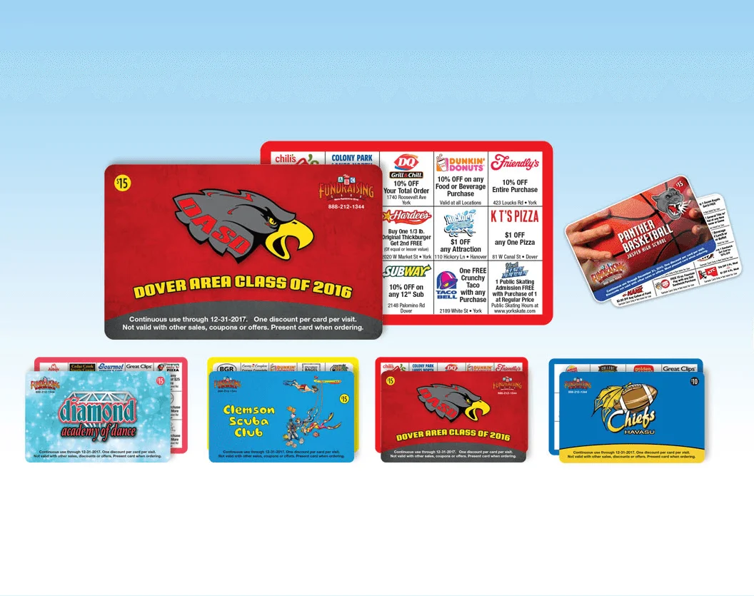 The Coupon Book contains 30 discount slips. Each coupon (slip) has money saving discount deals from nine different area businesses. The Customer takes the Coupon to the area Business and redeems their discount.
